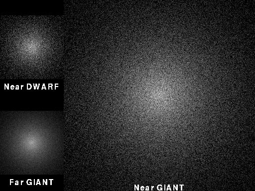 Wenn eine Galaxie zu fern ist um noch einzelne Sterne auflösen zu können, kann man die Entfernung immer noch über statistische Fluktuationen in der Anzahl der Sterne pro Pixel schätzen. Bei einer nahen Galaxie mögen 100 Sterne in jedes Pixel eines Fotos projiziert werden, während entferntere Galaxien größere Zahlen als 1000 aufweisen dürften. Die nahe Galaxie dürfte +/- 10% Fluktuation in der Oberflächenhelligkeit (1/sqrt(N)) zeigen, während die entferntere bei 3% Fluktuation liegen könnte. Eine Grafik [75 kB] zur Illustration zeigt eine nahe Zwerg-Galaxie und eine Riesengalaxie in einer Entfernung, in der ihr gesamter Strahlungsfluß der gleiche wie der der nahen Zwergin ist. Beachte, daß die entfernte Riesengalaxie ein viel unschärferes Bild zeigt als die nahe Zwergin.